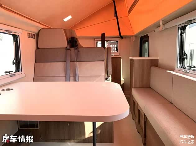 后方的生活空间没有多么华丽的内饰,主打一个朴实和实用。会客区还是经典的四人对卡座,整车核载6人,驻车后可在这里用餐,休息;晚上休息的时候中间桌板下降,卡座就可以拼成一张床铺,但是比较适宜一个人睡。