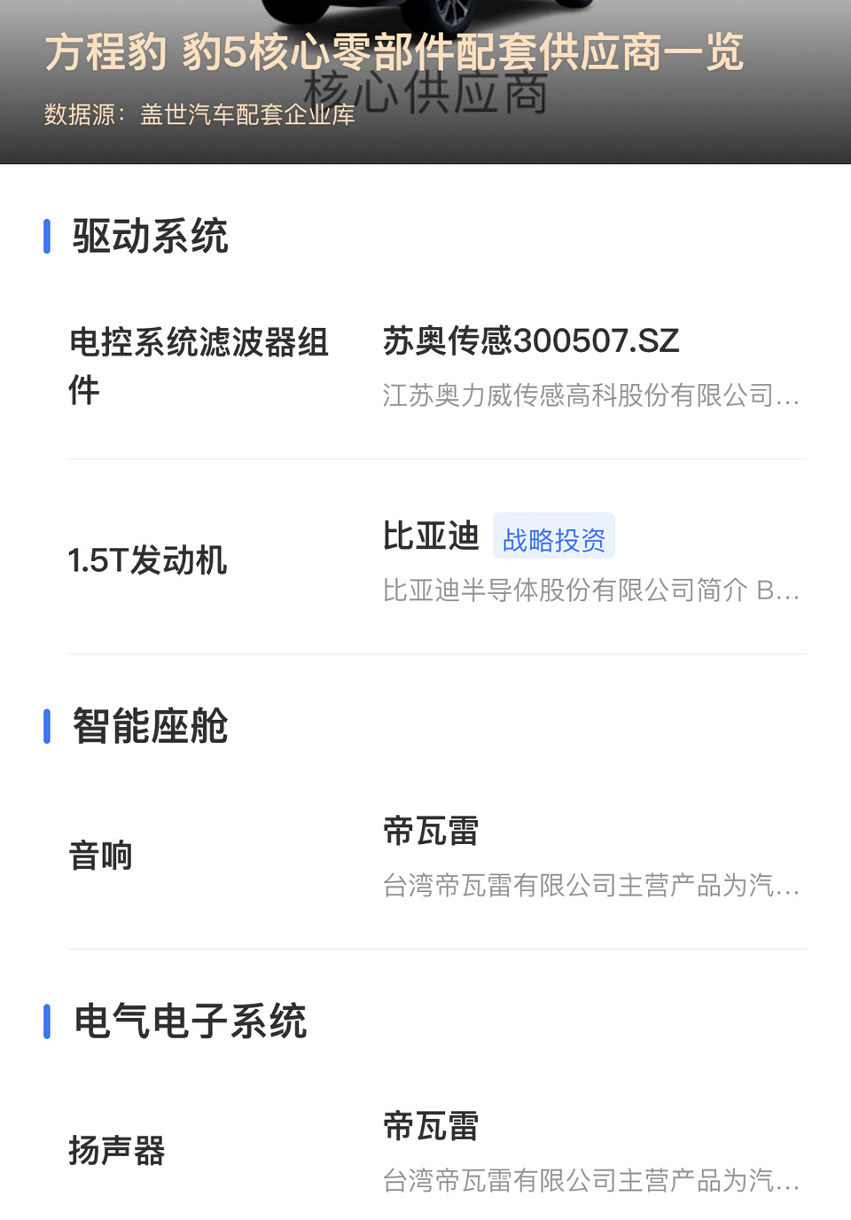 方程豹 豹5部分零部件供应商一览(数据来源于盖世汽车)。