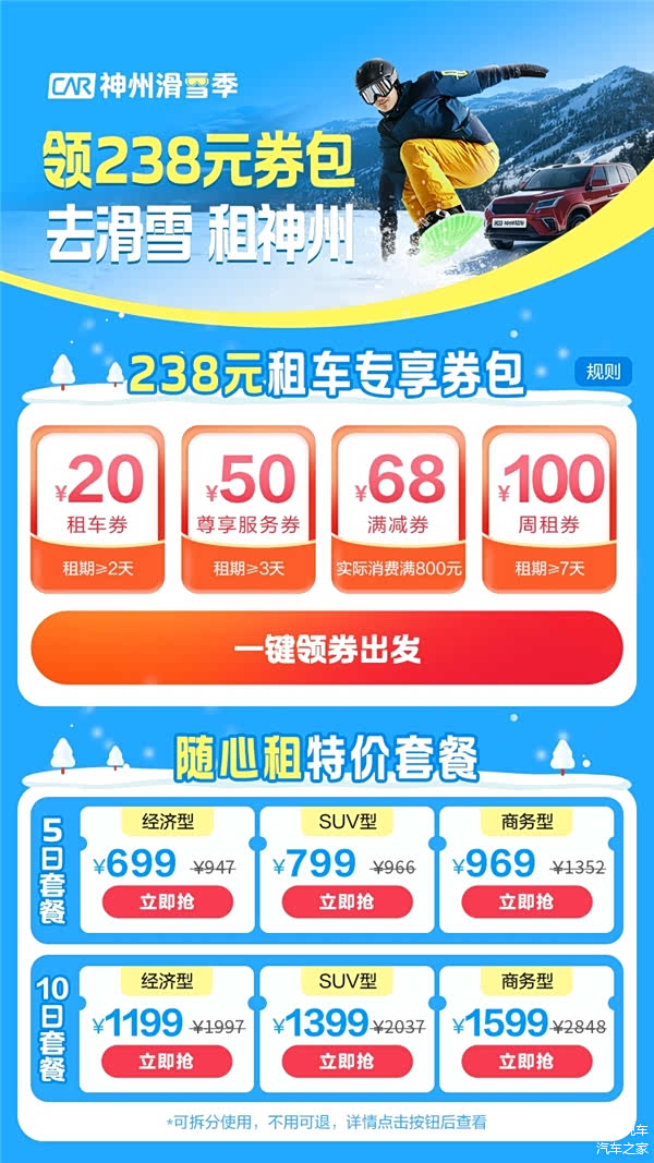 另外,神州租车的“神州滑雪季”活动正在火热进行中,238元优惠券一键即领,同时还有滑雪随心租套餐可选,5天套餐低至699元,张家口、长白山、吉林、乌鲁木齐、阿勒泰等各大滑雪圣地均可用,下单后既能一次性使用,还能拆开多次使用,周中周末均可用(法定节假日及前一天不可用),不用随时退,过期自动退。