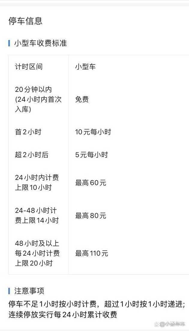 首2小时每小时10元,超2小时后每小时5元,24小时内计费上限10个小时,最高收费60元,24到48小时计费上限14个小时,最高收费80元,48小时及以上每24小时计费上限20个小时,最高收费110元。