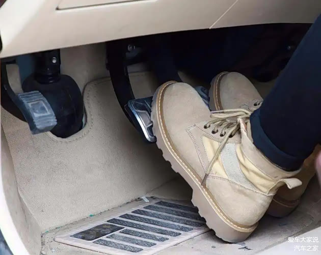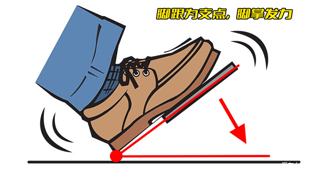 当需更大刹车力度的时候仍然用前脚掌接触刹车踏板,但改为腿部发力,推动脚掌继续往下“顶”刹车踏板。因为此时刹车踏板的阻力增加,仅靠脚踝发力会很累。腿部发力更有力道,而且不用怕力度大踩多了,因为踏板变重了。
