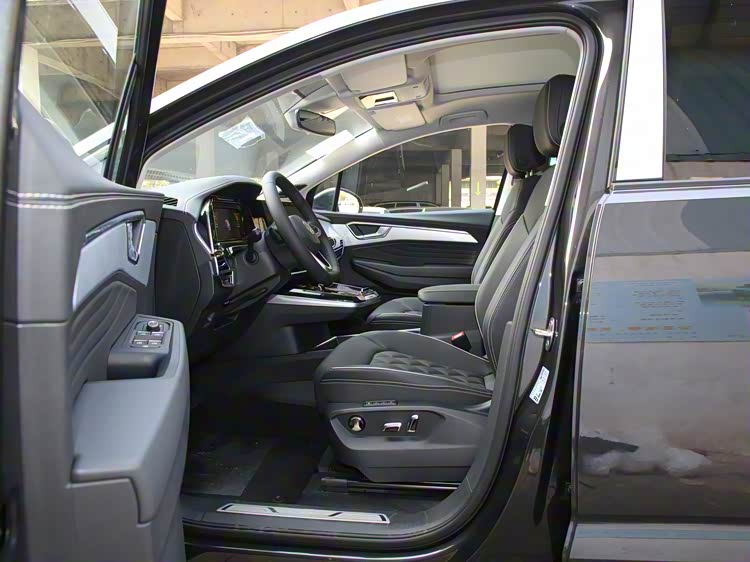 接下来,我们看看揽巡。它在外观方面,整体车型显得宽大厚重,长宽高尺寸达到了4936/2015/1756mm、轴距2980mm。而新增的黑光骑士版车型,在细节层面有着些许优化,例如增加了亚光黑色的车顶行李架、高亮黑配色的外观套件、以及高亮黑的21英寸轮毂。内饰方面,揽巡有着家族化的设计理念,分层式的设计,让车内的层次感颇为鲜明。