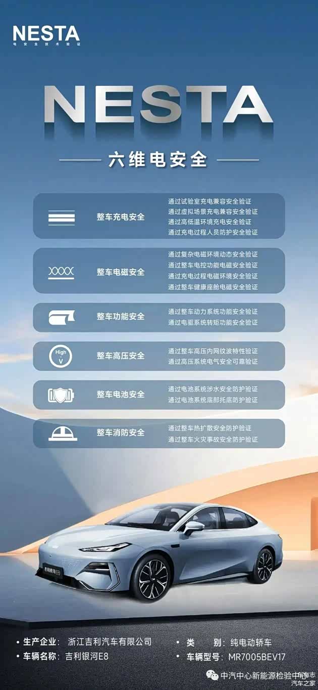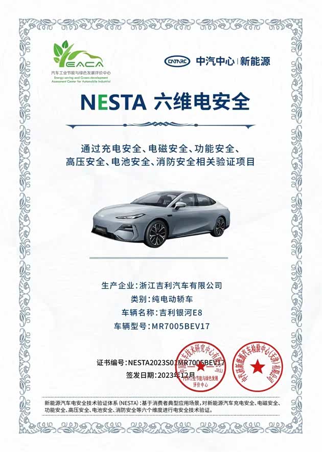 据中汽研新能源汽车检验中心(天津)有限公司(简称“新能源检验中心”)消息,浙江吉利汽车有限公司,吉利 银河E8(MR7005BEV17)按照新能源汽车电安全技术验证体系(NESTA)有关要求,通过充电安全、电磁安全、功能安全、高压安全、电池安全、消防安全相关验证项目,予以颁发验证证书。