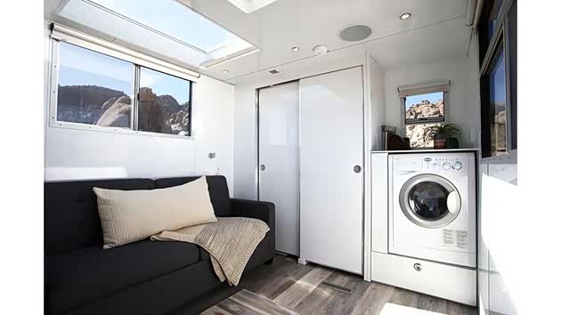 通过图片真的很难分清这到底是住宅还是房车,宽大的厨房区中间是一个全尺寸岛台,其他诸如不锈钢门冰箱、多孔燃气灶、微波炉、洗碗机以及大量的橱柜和抽屉空间全部不是问题,简直超乎想象。
