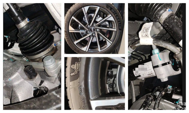 四个轮毂均没有剐蹭和变形痕迹,轮胎日期也能对上,没有鼓包和开裂现象,四根减震和刹车分泵也是展新的,没有拆卸和渗漏痕迹。