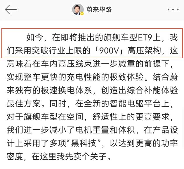在即将推出的旗舰车型ET9上,蔚来将采用900V高压架构,这将使得充电效率更快、续航里程更长。结合蔚来独有的换电体系,这种配置几乎可以完美解决电动车的续航问题。