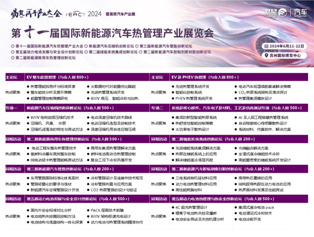 2024EAC第十一届国际新能源汽车热管理产业展览会将为大家呈现第十一届国际新能源汽车热管理产业大会、新能源汽车压缩机创新论坛、第三届新能源汽车管路创新论坛、第五届动力电池发展与安全设计创新论坛、第二届储能系统集成创新论坛、第二届新能源汽车胶粘剂密封胶创新论坛、第二届新能源商用车热管理创新论坛等7场标杆会议。