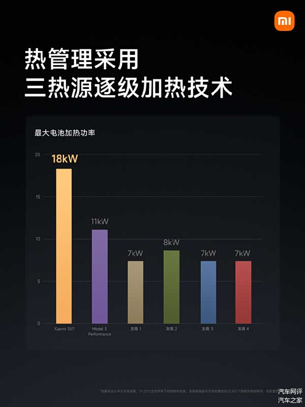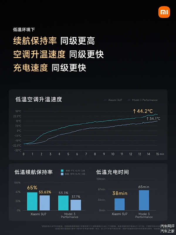 根据官方公布的数据,与特斯拉Model 3 Performance相比, 小米SU7在低温空调升温速度、低温续航保持率和低温充电时间三个测试项目中表现出色。这些技术的应用使得小米电动车在寒冷的冬季依然能够表现出卓越的性能,让电车不再畏惧寒冬的挑战。