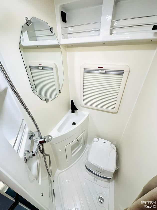 卫浴间采用吸塑一体式设计,方便清新打扫。内部配备有座便器、洗手池、25L电热水器、独立淋浴、梳妆镜、换气扇等。水电系统方面,本车配备300L清水箱、43L灰水箱、3000W逆变器、5000W柴油暖风、800Ah锂电池、550W太阳能等。