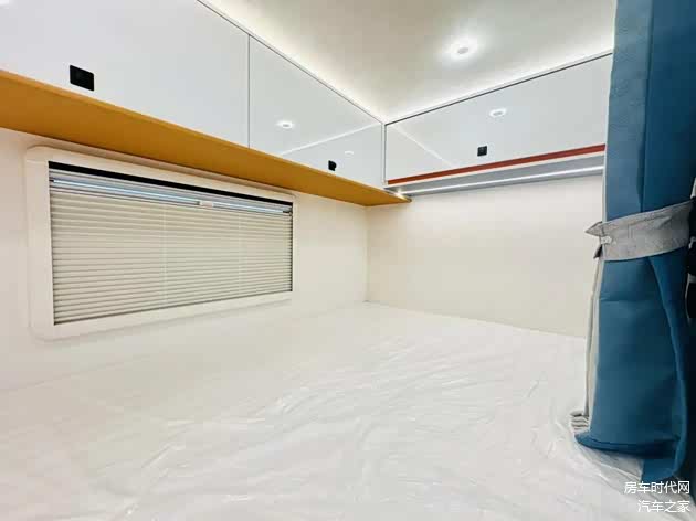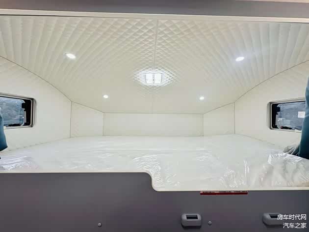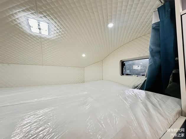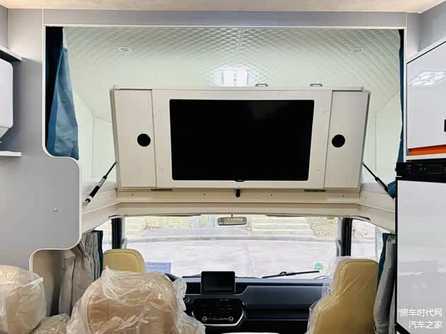 驾驶室上方为额头床区域,床铺尺寸为1400×2200mm,可以轻松容纳双人休憩。额头床两侧配有隐私帘,拉上可为休息区带来隐蔽空间。床铺下方配备32寸小米电视,为车友带来优质影音娱乐体验。