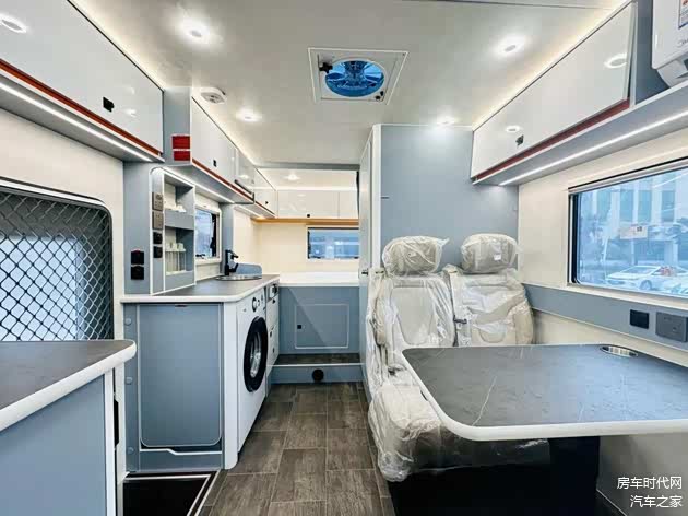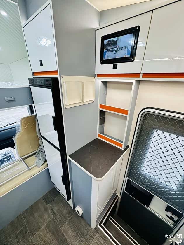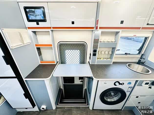 厨房区位于进门处,采用左右分区设计。料理台面台面配备不锈钢大尺寸洗菜池,方便用户备菜洗菜。下方料理台内嵌有7kg家用洗衣机,让用户轻松洗涤衣物的同时,节省更多生活区空间。另一侧则设有多层橱物柜,为用户提供调料和碗筷收纳空间。置物台一侧配有168L房车车载冰箱,方便车友冷藏和保鲜食物。
