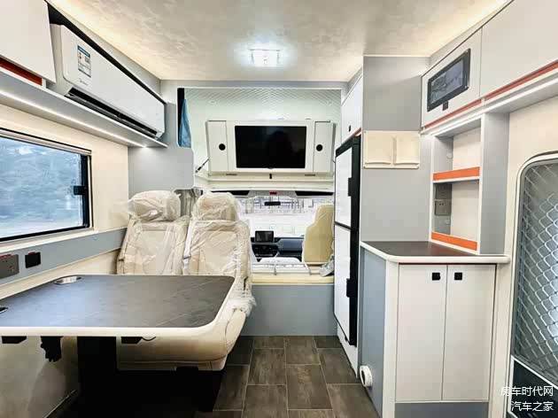 会客区采用双人对坐式卡座设计,中间配有升降桌、充电口,既方便了车主和乘客用餐,又为办公和娱乐提供了便利。会客区一侧配备大尺寸推拉窗,为乘坐者带来更宽敞、明亮的旅居环境。