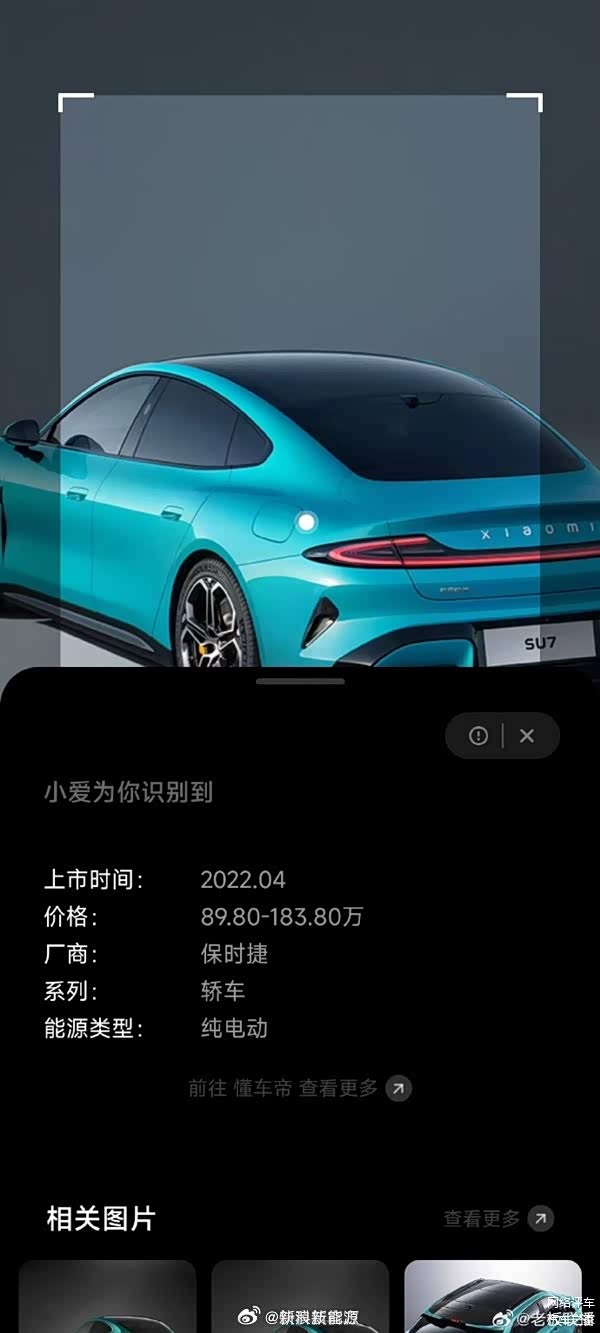 【#小爱把小米汽车识别为保时捷#:网友喊话这是乌龙】有网友发现,使用小爱同学识别 小米SU7图片,结果显示为“保时捷” ,这也引发了网友的热议。有网友表示,这个图这么识别本身就有局限性,没必要去暗示和意味什么。也有网友表示,小爱真是自己人,瞬间把小米SU7的身价提高到100万了。雷军发布会上宣称,要打造一台像保时捷、特斯拉一样的Dream Car ,要通过20年的努力做业界前5,为中国汽车工业而奋斗。