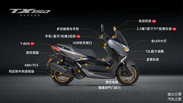 据悉TX250是基于现有TX150平台所打造的一款排量更大的车型,这使得这两款车在外观上并没有太大不同,只不过250版本因为车身略有延长,轮毂直径有所加大所以看着会更有气势。