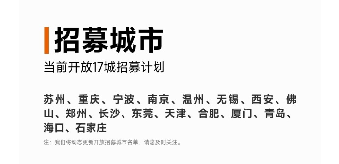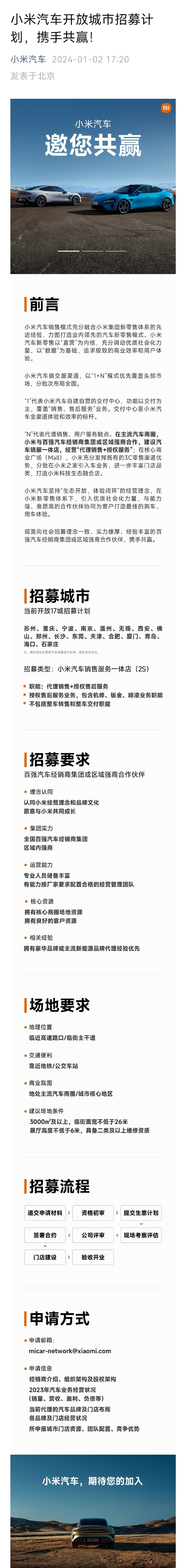 小米汽车开放17个城市招募计划,招募类型为小米汽车销售服务一体店 (2S),划重点: