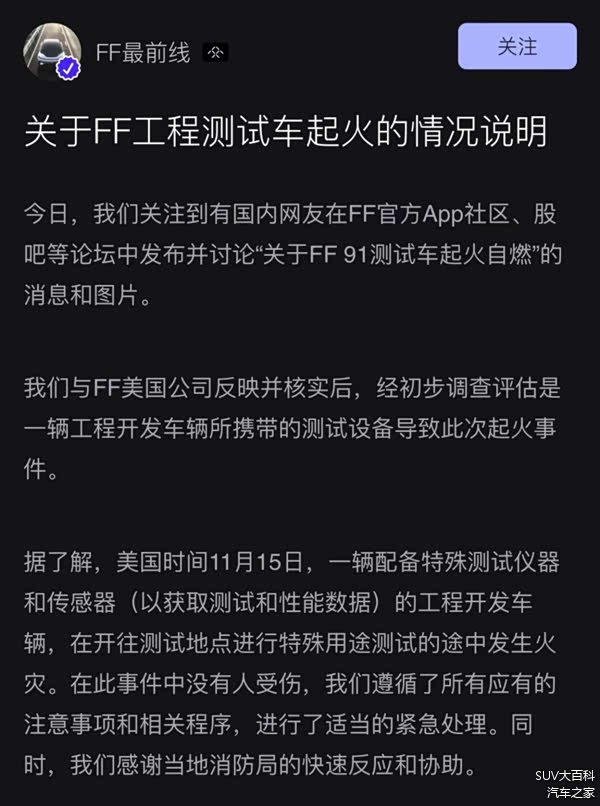 FF 91这款车去年统共交付了10台,确实没出现自燃的情况,不过在2022年,一台工程样车被发现在路边烧毁,官方给出的解释是车内所携带的测试设备起火引发的,并非车辆电池本身原因。