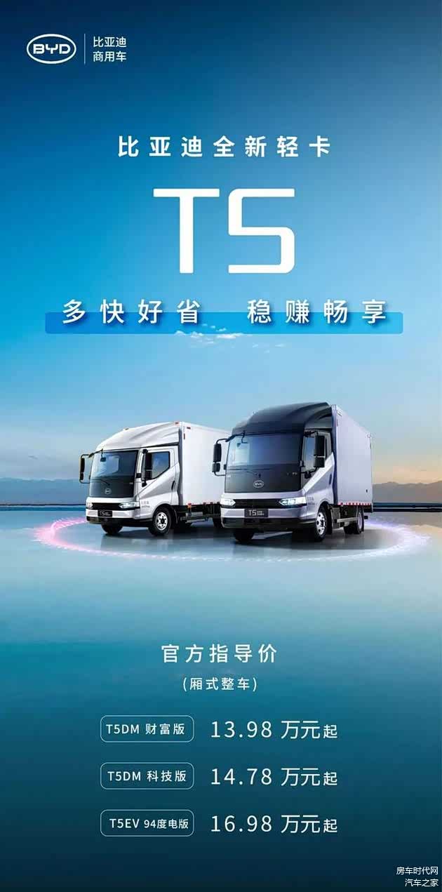 近日,比亚迪旗下全新轻卡T5正式上市,提供DM插电混动和EV纯电动两个版本,官方指导价区间为13.98万-16.98万元。