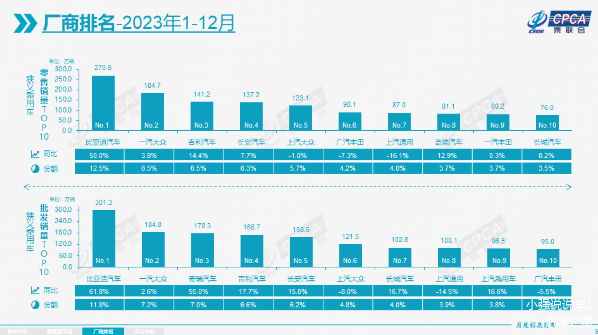在乘联会数据中,乘用车批发排名表中,前十名中国产车品牌占据了6席,合资车中硕果仅存的只有一汽大众、上汽大众、上汽通用和广汽丰田,而在狭义的乘用车零售表中,比亚迪强势登榜第一名,超过一汽大众将近100万辆,也创造了国产车品牌中的奇迹,而吉利汽车、长安汽车分别位列第三名和第四名。