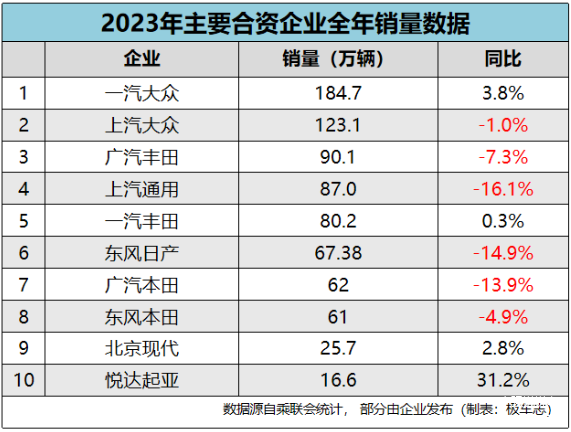 在企业销量方面,大部分的合资企业的确陷入了负增长或微增长。比如上汽大众下滑了1%,广汽丰田下滑了7.3%,上汽通用和东风日产、广汽本田都下滑了两位数,东风本田也下滑4.9%,一汽丰田仅增长0.3%,北京现代跌到谷底之后,微增了2.8%,悦达起亚表现突出,但那是因为它有半数产品转了出口,国内其实只卖了8万多台。