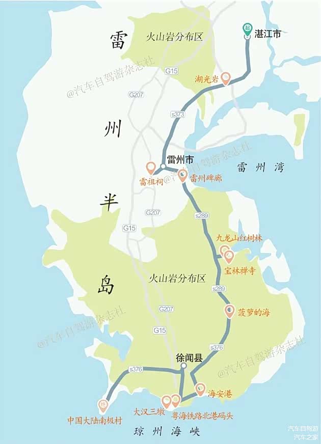 如果大家对雷州半岛这个名称略觉生疏的话,那么半岛最南端的徐闻县,在自驾圈里可谓是大名鼎鼎了,因为每逢冬季,尤其是春节假期前后,全国各地很多车友都会通过徐闻的港口连人带车一起渡海,往来于海南岛避寒度假外加环岛自驾游。湛江,是个非常不错的落地自驾游的起始城市,我们在机场租了车,跨过湛江海湾大桥(15元路桥费),由此正式踏入了雷州半岛。