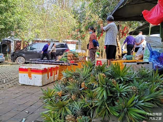 通往菠萝的海核心区的彩虹公路是广东十大最美旅游公路之一,可以径直将车开到菠萝田边的停车场。每年的12月至次年6月是收获菠萝的季节,到了4 月底更是菠萝上市的旺季。采摘、打包、装车、打卡拍照……,无论是果农还是游客,人人都忙得不亦乐乎。据统计,仅曲界镇每天上市的菠萝即可达150万斤,有人估算过,全国每卖出的三只菠萝中就有一只产于“菠萝的海”!