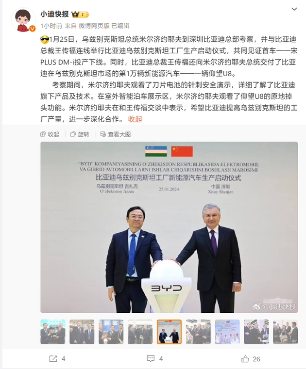 在1月25日的重要访问中,乌兹别克斯坦总统米尔济约耶夫亲临深圳比亚迪总部,见证了比亚迪在乌兹别克斯坦投产的首款车型——宋 PLUS DM-i的诞生。同时,比亚迪总裁王传福向米尔济约耶夫递交了象征性的第1万辆新能源汽车——仰望 U8,标志着比亚迪在乌兹别克斯坦市场取得的显著成就。