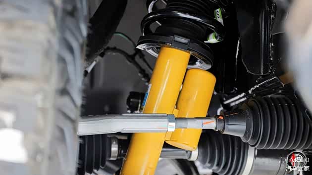从前开放式的竞技前杠能看到黄色的减震系统。前悬架采用双叉臂式独立悬挂,搭配多连杆结构后独立悬挂。而从远处能看到的黄色组件是一组BILSTEIN的氮气减震。内部填充的高压氮气使减震系统具备更加出色的稳定性;同时,经过强化的阻尼力能够提升车辆的支撑性和操控性,对于一台硬派越野车来说是加分项。