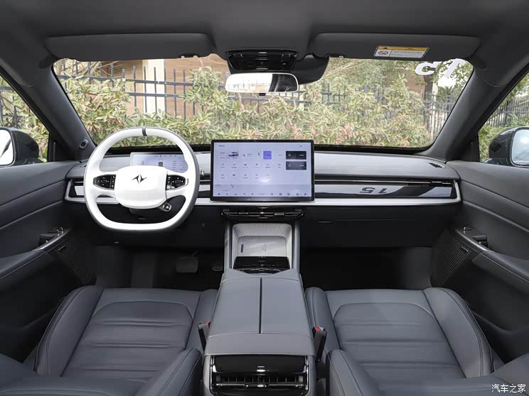 内饰方面,新车采用时下新能源常见的极简式设计取向,配备双色材质包裹的两辐式多功能方向盘以及15.6英寸悬浮式中控屏,内置系统由高通骁龙8155芯片提供支持。