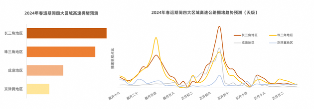 从区域来看,预计春运期间长三角地区、珠三角地区高速拥堵程度较高,其次是成渝地区,京津冀地区拥堵里程占比较低,长三角地区、珠三角区域高速拥堵里程占比约为京津冀地区3倍;珠三角地区出程高速拥堵程度高于返程,且在四大区域中出程拥堵程度最高,返程长三角地区高速拥堵程度最高。