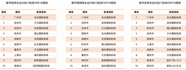 机场方面,预计春节前驾车出行热门机场主要有广州白云国际机场、北京大兴国际机场、深圳宝安国际机场。预计春节期间,驾车出行热门机场主要有广州白云国际机场、深圳宝安国际机场、北京大兴国际机场。春节后,预计广州白云国际机场、深圳宝安国际机场、杭州萧山国际机场驾车出行热度较高。