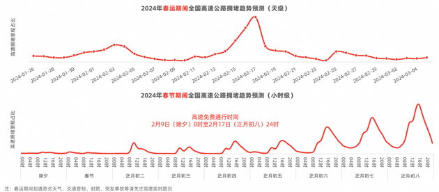 近日,高德地图根据多年同期历史数据,对全国交通拥堵趋势及出行特征进行预测,发布了《2024年春运出行预测报告》,以下简称(《报告》)。《报告》预测,春节期间预计2月11日(正月初二)上午时段全国高速交通压力较大,而返程高峰为春节假期最后一天2月17日(正月初八)。