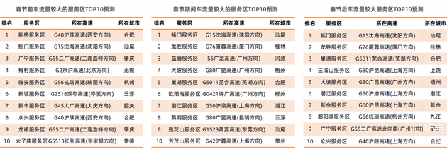 高速服务区方面,预计春节前车流量较大服务区主要有新桥服务区(G40沪陕高速东向西)、鲘门服务区(G15沈海高速西向东)、广宁服务区(G55二广高速南向北)。