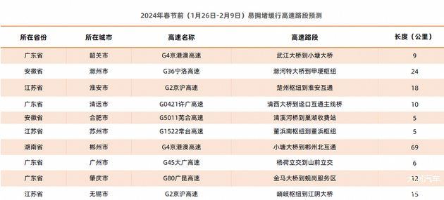 从具体拥堵路段来看,春节前,预计全国高速易拥堵缓行路段主要是: G4京港澳高速韶关段(武江大桥到小塘大桥)其次是G36宁洛高速滁州段、G2京沪高速淮安段等。