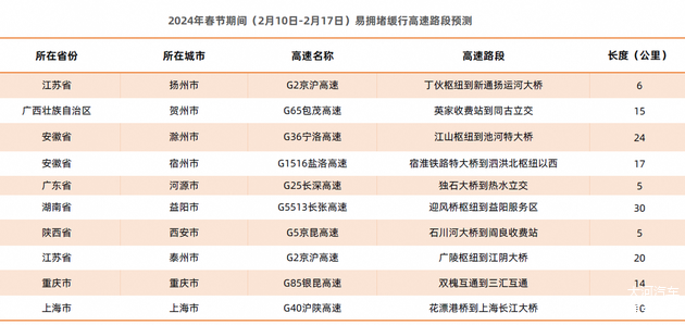 春节后,预计全国高速易拥堵路段主要是G65包茂高速贺州段(英家收费站到同古立交),其次是G36宁洛高速滁州段、G2京沪高速扬州段等。