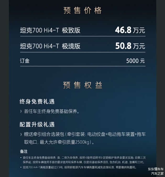 坦克700 Hi4-T首发限定版的售价早已公布,70万元的售价让网友们高呼“黑心”,但那毕竟是个限量版车型,而且整个车身采用大量的碳纤维外观件,成本本来就要比普通版车型更高,再加上限量版车型的身份加持,售价高一些倒也说得过去,但是对于大多数消费者来说这样的价格确实承受不了。没有关系,坦克700 Hi4-T普通版车型的预售价现已公布,让我们一起来了解一下吧。