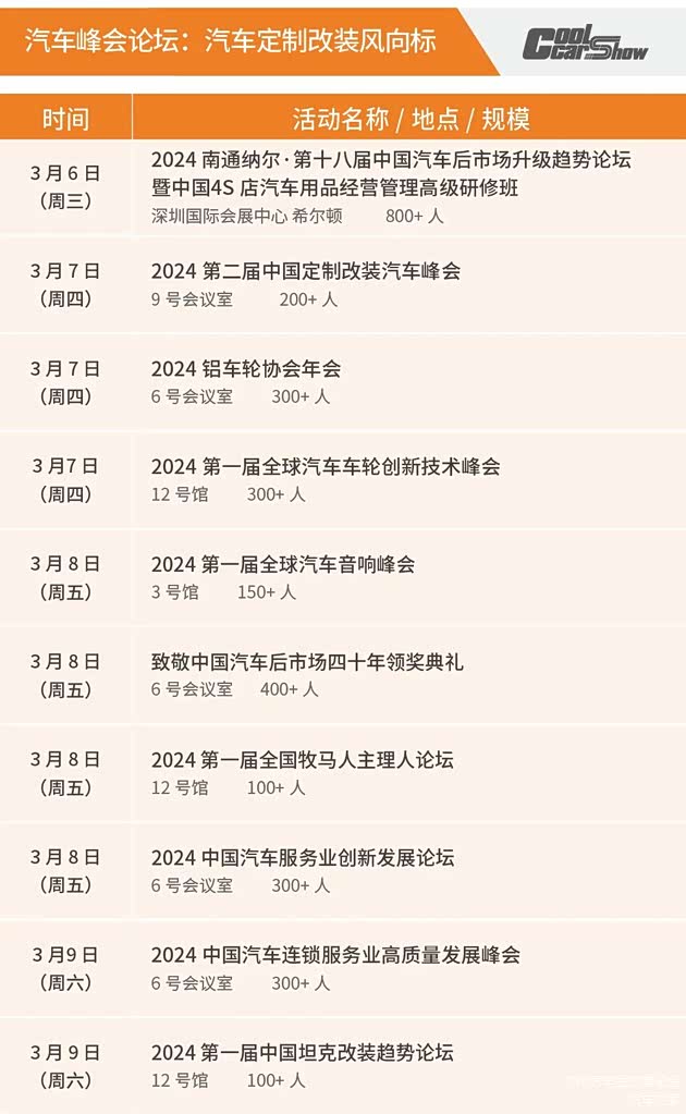 2024深圳国际定制改装汽车展览会将举办峰会、论坛、文化赛事等一系列的精彩活动。从解读行业趋势到树立业界标杆、从最新定制车车型到创新改装零部件、从改装娱乐到个性消费潮流引领,为定制改装汽车市场带来全新的趋势方向,开拓出全新空间。