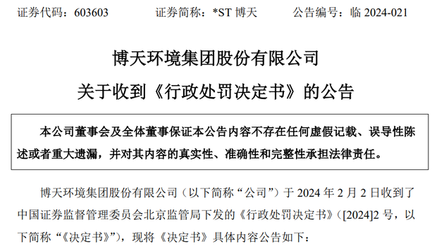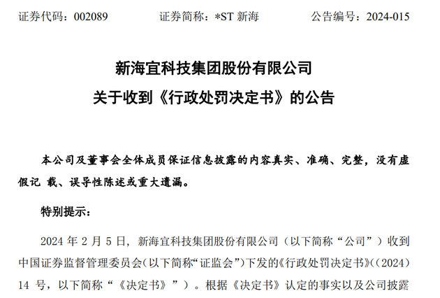 *ST新海收到的中国证监会下发《行政处罚决定书》((2024)14号,简称“《决定书》”)显示,因参与专网通信业务以及会计处理不当,*ST新海2014年至2019年年度报告及2019年半年度报告财务数据均为虚假记载。