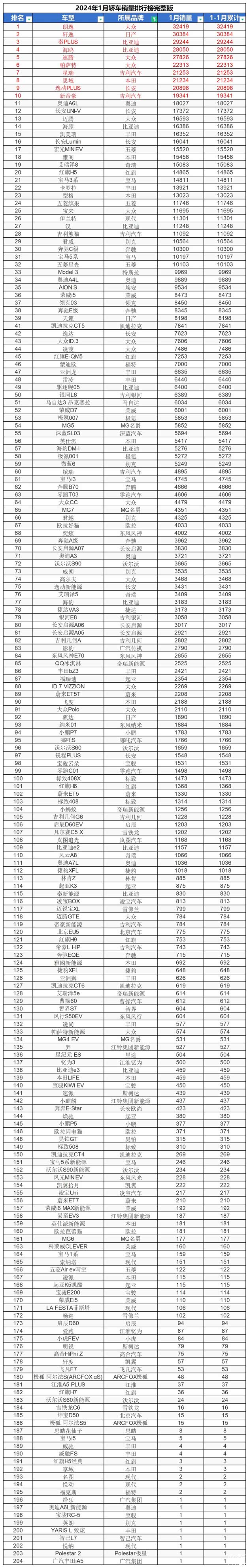 2024年1月汽车销量排行榜完整版出炉了,作为年初首个销量月,为新的一年打下一个良好的开门红,也是春节买车的关键销售月份,各大车企在1月份销量有升有降,燃油车销量持续回暖。下面小编就带大家看一下这份榜单。