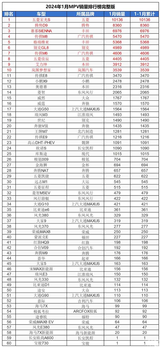 MPV榜单:五菱宏光S位居销量榜首,月度销量10136辆,腾势D9以8360辆和丰田赛那以6976辆分居二、三位,从MPV前10名看,自主品牌占6席、日系占3席、美系占1席。