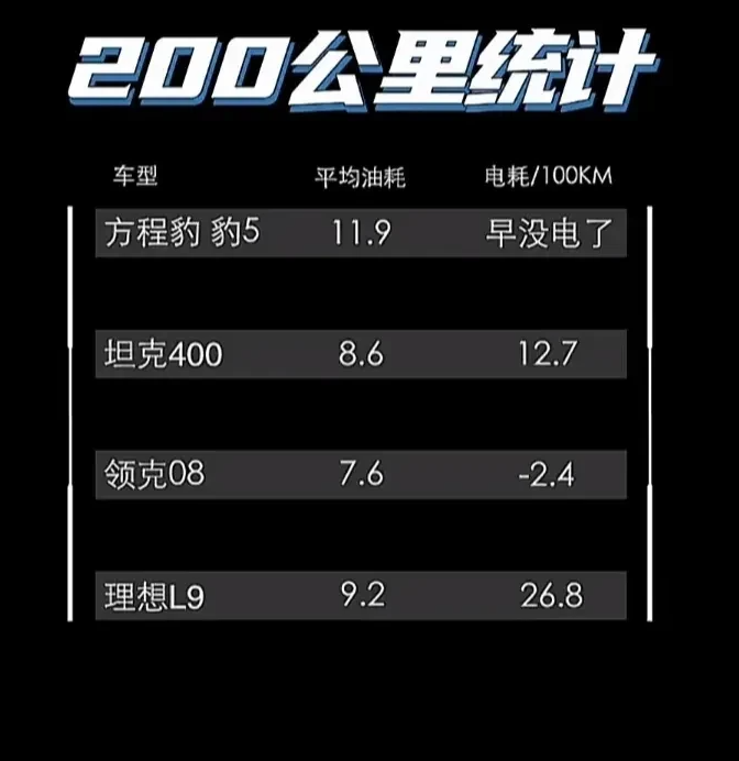【网友分享了一张方程豹豹5的油耗】 相关车评人分别对方程豹豹5、坦克400、领克08、理想L9进行了油耗测试。 200KM统计结果为: 方程豹豹5 不保电,平均11.9L/100KM; 坦克400平均油耗8.6L/100KM; 领克08 平均油耗7.6L/100KM; 理想L9平均油耗9.2L/100KM。 豹5成为油耗最高车型,相比其他3款车型,简直“弱爆”了!当然这其中豹5是最重的。 大家觉得可信度多少?