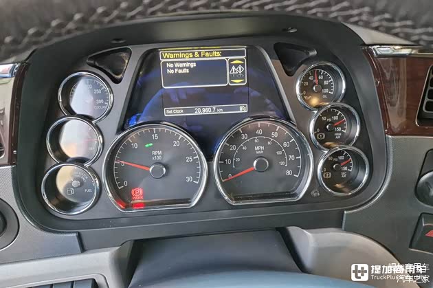 仪表盘由多枚机械仪表组合而成,下方2个大尺寸表为车速表及发动机转速表,周围的6个小尺寸表为油量表、水温表、气路压力表等等,极具美式卡车的“钟表店”特色。在第二代彼得比尔特579上,这种经典的仪表设计被更改为了全液晶仪表,相当遗憾。