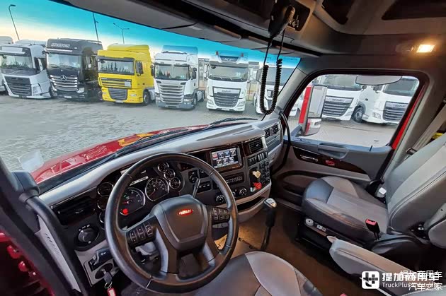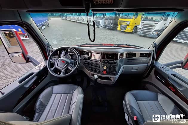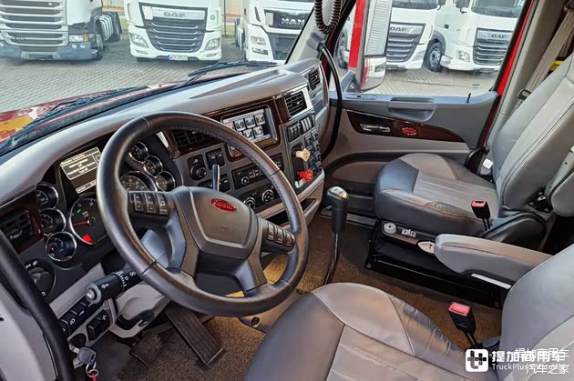 主副驾驶座椅均采用真皮面料,并配备气囊减震系统。头枕上带有Peterbilt标志拓印,起到标识身份、提升高端感的效果。
