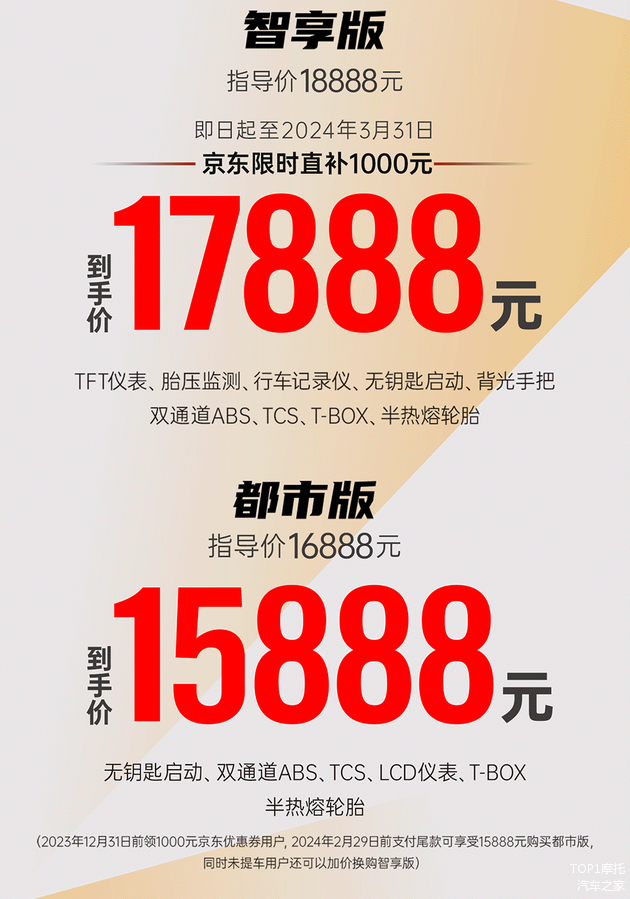 新推出的智享版,限时售价为17888元,即日起到3月31日,可享受1000的限时补贴,原价18888元补贴之后为17888元。而原有的都市版,之前领到过1000优惠券的车友,在2月29日之前支付尾款,同样能够享受到15888元的价格。