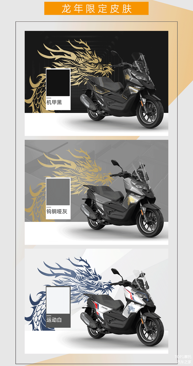 为了迎接龙年的到来,赛科龙RT2还为智享版推出了龙年限定版画,虽然只限量500台,但是并不需要额外加钱。喜欢这款“皮肤”的车友,需要自己拼手速了,特别是对于龙属相的车友来说,这款“皮肤”意义非凡,而之前提供的几种经典配色,并不会受到影响,依然正常销售。