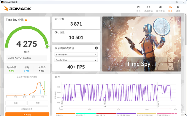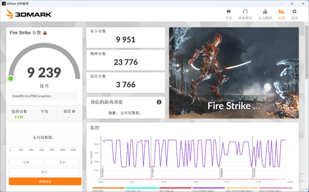 其次是Arc集成显卡的性能表现。使用3DMARK对其进行测试,得到TimeSpy显卡分3871;FireStrike显卡分9951。这个成绩已经完全是入门级独显的水平了,比如GTX1650、A380等产品,表现异常出色。