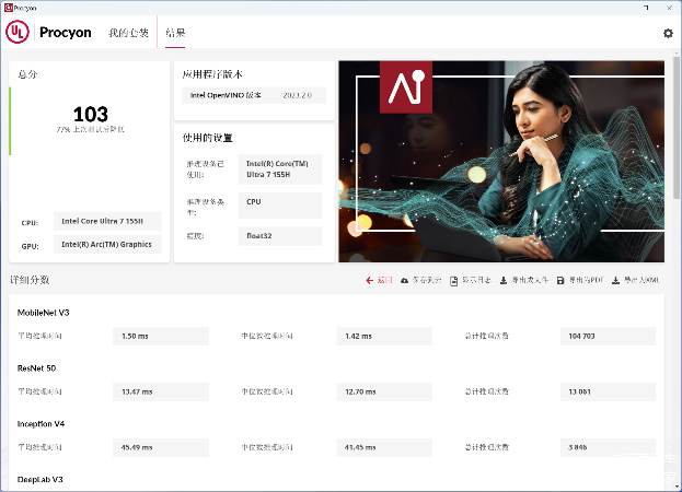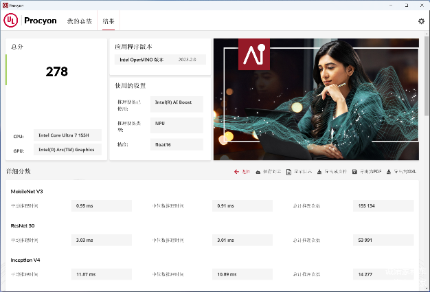 最后是NPU的性能测试。使用UL Procyon对NPU进行测试,使用IntelOpenVINO,最终在精度为float32下的成绩为268、在精度为float16下的成绩为278。这个成绩相当给力,对比CPU进行同样测试,两个精度下的成绩分别为103和104。NPU相比CPU的AI性能已经是翻倍还要高。