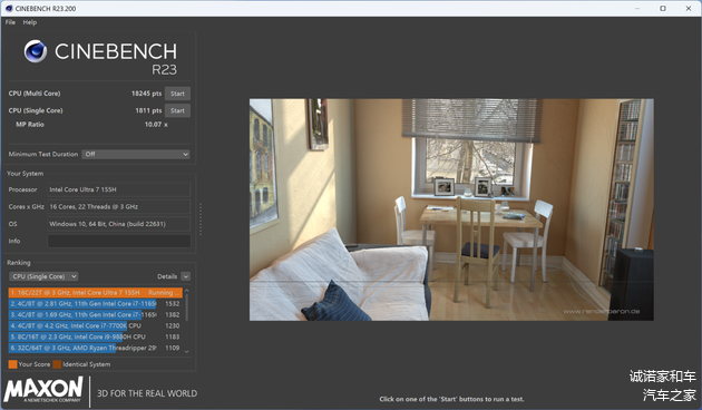 首先是处理器的传统性能。使用CinebenchR23进行测试,得到多核成绩18245pts、单核成绩1811pts,表现非常不错,属于目前轻薄型移动平台的旗舰水平。