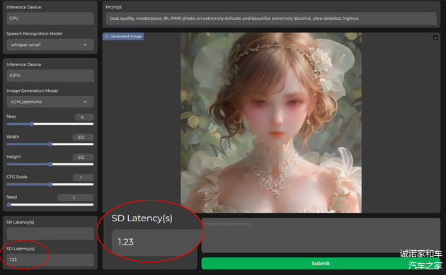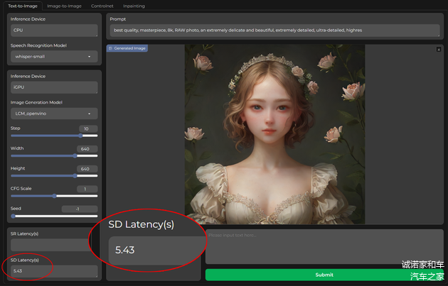 使用的软件是大家比较熟悉的Stable Diffusion,版本为英特尔定制版。在Step=4、图片尺寸为512×512下,实测生图时间仅仅只需要1.23秒,非常快。当然,由于Step太低,图片可用性很差。将Step设置为10、图片尺寸更改为640×640之后,实测生图时间为5.43秒。也就是不到6秒的时间就可以生成一张高清图,而且生成图片的质量相当不错,完全可用。从这项测试可以看到,在酷睿Ultra7 155H的加持下,Redmi Book Pro 16 2024拥有不错的AI性能,是一款性能不错的AIPC。
