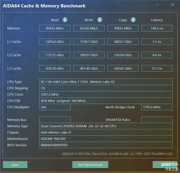当然,Arc集成显卡拥有如此出众性能,与Redmi Book Pro 16 2024采用的高频内存有很重要关系。Redmi Book Pro 16 2024采用的是32GB LPDDR5X 7467MHz内存,实测内存读取85435MB/s、写入65165MB/s、复制93835MB/s,实力完全不输桌面平台。