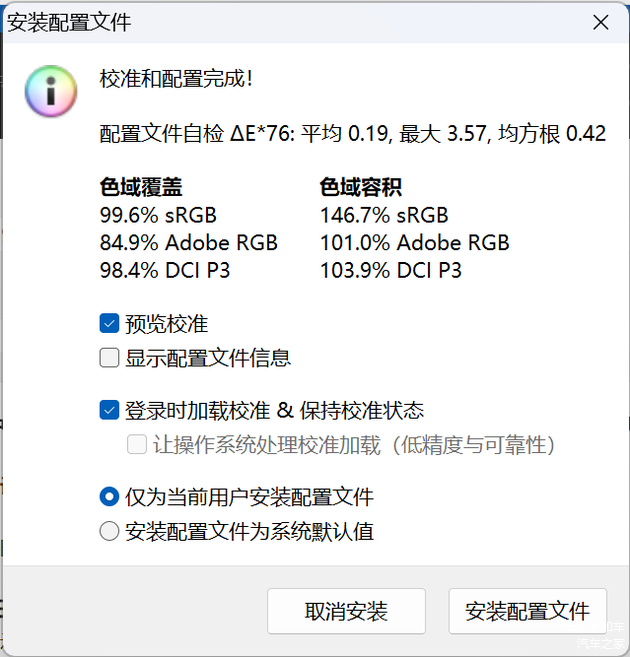 色域方面,实测色域覆盖99.6%sRGB、84.9% AdobeRGB和98.4% DCI-P3;色域容积覆盖146.7%sRGB、101% AdobeRGB和103.9% DCI-P3,符合官方宣传。